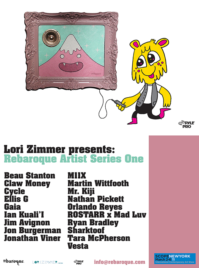 Debuting at SCOPE New York, The Rebaroque Artist Series Sound Wall, curated by Lori Zimmer, combines our passions- art, sustainable design and music. Each Rebaroque sound panel is made from vintage fabrics, frames, hand painting and high quality Pyle speakers, and hook right up with your iPod or smart device. We’ve selected 20 artists to create unique collaborative pieces that not only look great on your wall, but play your favorite music as well. Artists include Beau Stanton, Claw Money, Cycle, Ellis G, Gaia, Ian Kuali’i, Jim Avignon, Jon Burgerman, Jonathan Viner,M11X, Martin Wittfooth, Mr. Kiji, Nathan Pickett, Orlando Reyes, ROSTARR x Madluv, Ryan Bradley, Sharktoof, Tara McPherson and Vesta.