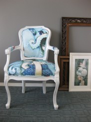 Her latest project is a collaboration with Seattle-based Rubbish Rehab in the creation of one-of-a-kind, antique chairs re-upholstered with fabric bearing d’Errico’s artwork. The first chair is designed with the “Loveless Bird” image. Every chair is a vintage or antique and the frame and upholstery are completely refurbished.