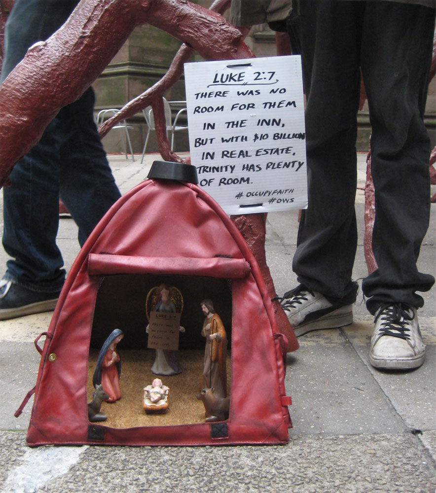 ‘As part of the Tenting Campaign, this diorama is a collaboration with the Yes Men, Poster Boy, and Occupy Faith. It’s a nativity scene, but under a tent in the fashion of OWS. The scripture is from Luke 2:7, “there was no room for them in the inn.” Referring to how Mary and Joseph, when looking for a place to give birth, were turned away at the inn. We are trying to make the connection with the incident(s) at Trinity. The church, which is the third biggest land owner in NYC, refuses to give protesters a vacant lot in which to camp. So we presented Trinity with this peace offering in hopes of reminding them who/what they’re here for, and just in time for Christmas too. Although they “accepted” the gift, by the time the press left Trinity evicted the nativity scene…how ironic. We added a functioning solar light on top, because I think baby Jesus would’ve liked that.’